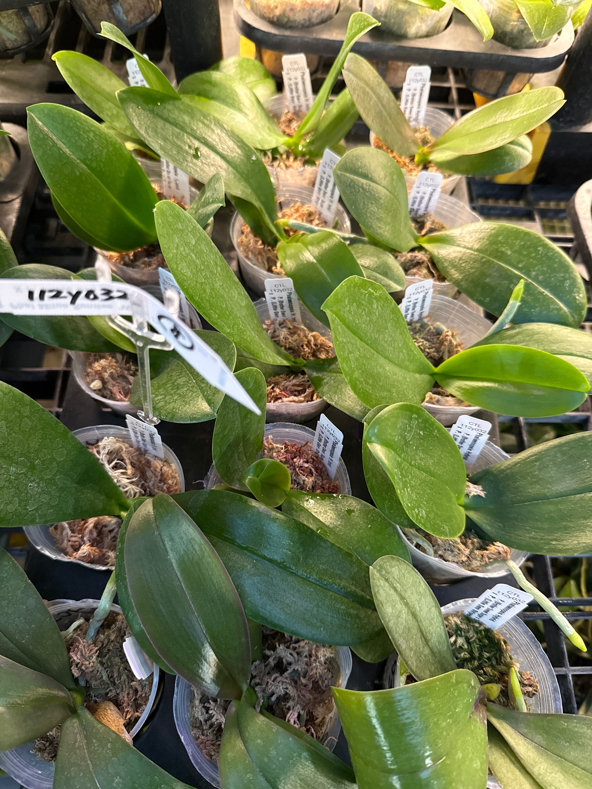 This seed-grown Phalaenopsis hybrid from CTL Orchids combines the yellow-flowered pollen parent Phalaenopsis (Little Gem Stripes x Taida Pearl) ‘flava’ with the pod parent Phalaenopsis (Brother Sweet Sugar x Zheng Min Michollens), known for its yellow green flowers and frequent flowering. The aim is to produce concolor yellow green flowers with darker yellow golden spots.