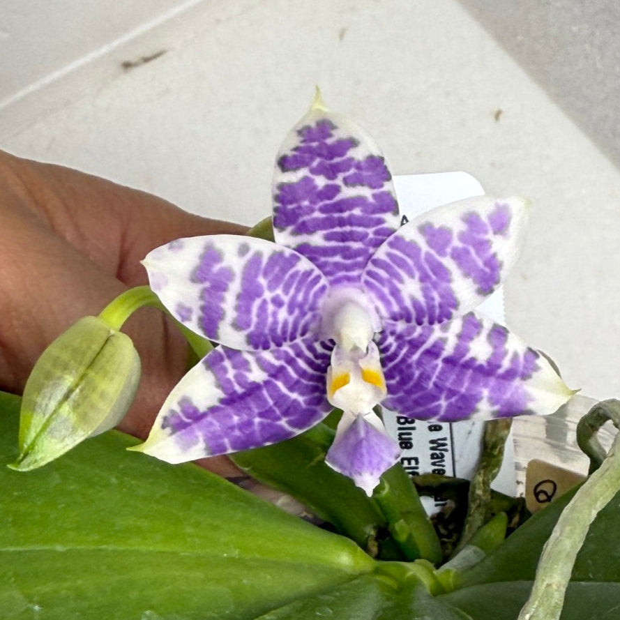 Parentage: Phalaenopsis (Mainshow Blue Wave 'blue flat' x Mainshow Blue Elf spot 'QB')
