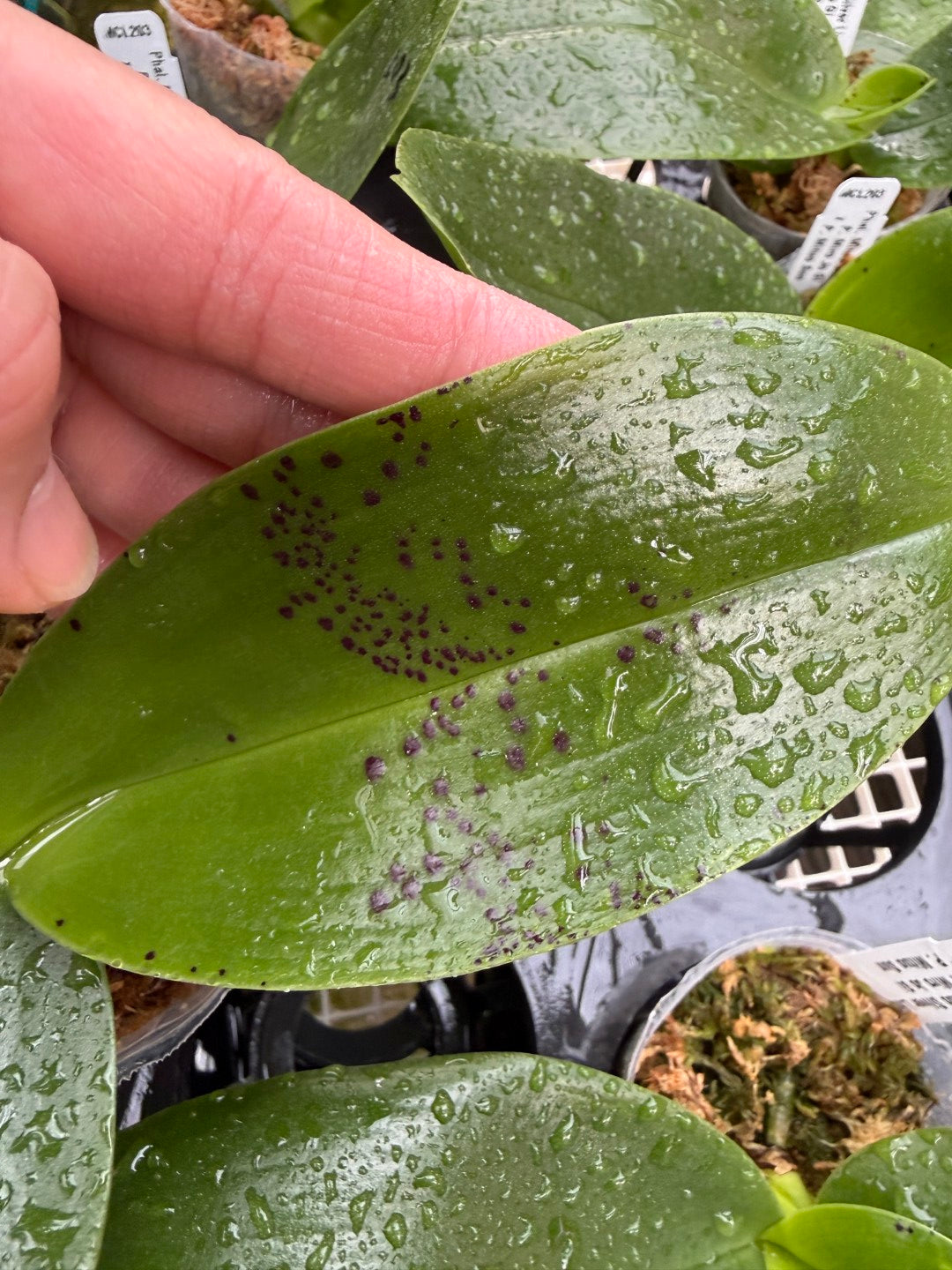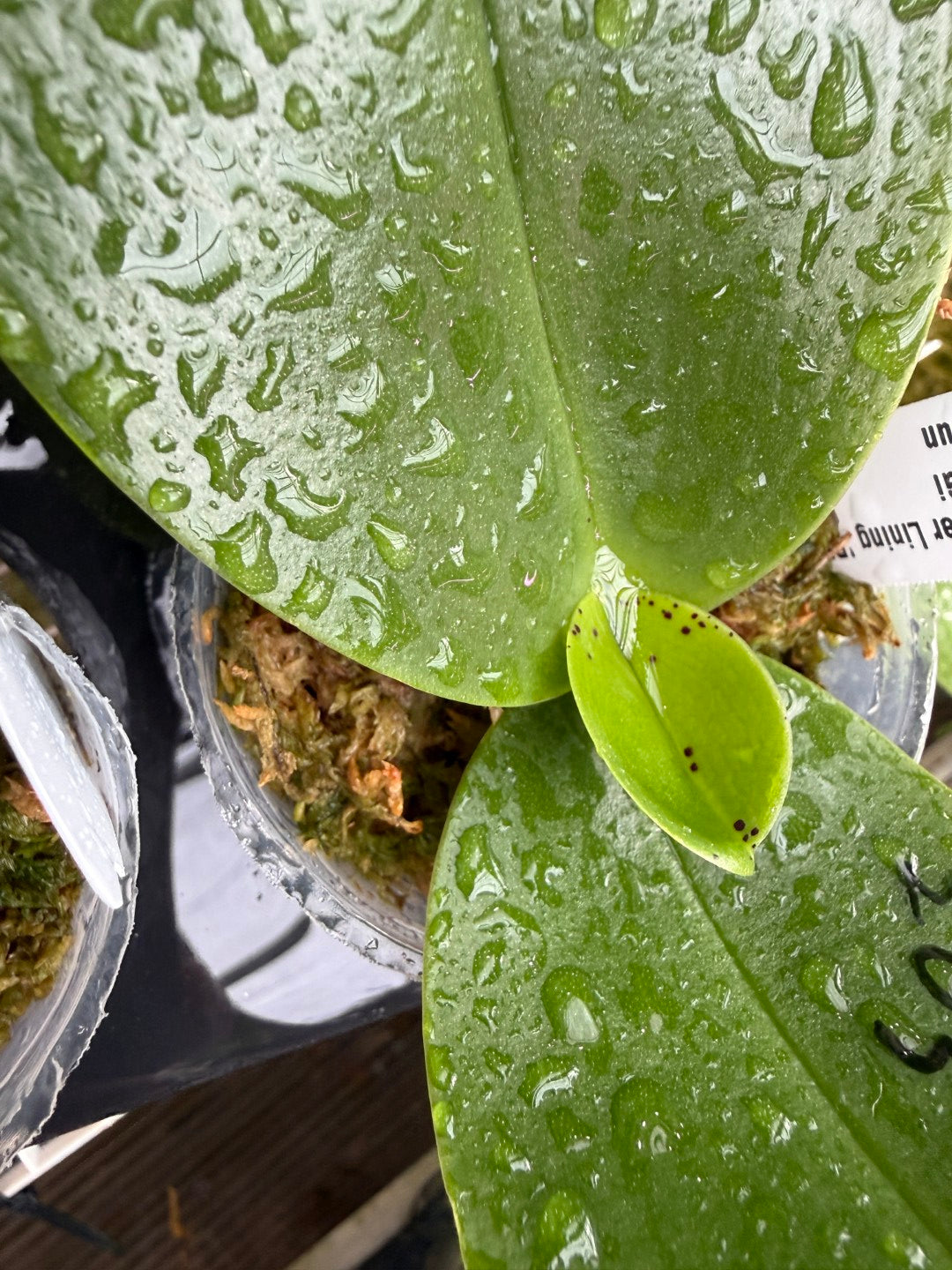 ‘Platinum Ruby’ is a notable flower from Mituo Orchids, named Silver Lining during the pandemic with Edward Yen’s help. Influenced by Phalaenopsis gigantea, it features waxy texture and raised spots. As a Phalaenopsis Mituo Sun hybrid with strong pigmentation, its new leaves display raised red spots that fade as they age. 38.1% Phalaenopsis gigantea.