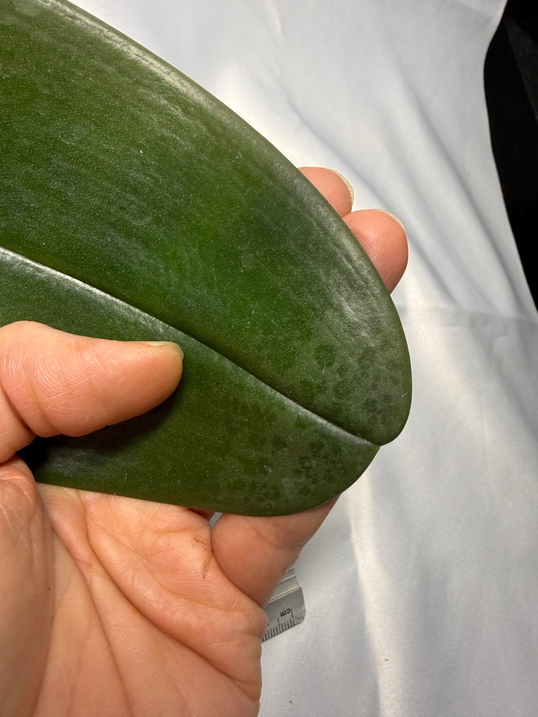 This is seed grown. in short spike to flower soon. Foliage of this plant is mostly green with a hint of silver from Phalaenopsis gigantea. There is a bit of mottled at the end of one leaf.